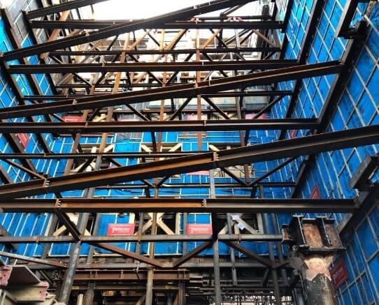 Once the initial temporary works scheme had been devised and implemented, it became apparent that the neighboring building was less structurally stable than initially thought. PCL took it upon themselves to install additional lateral braces to the three upper floors, tying the facades to the party walls with an additional temporary spine installed throughout. This was designed to rigidify the building, with a new permanent steel spine ultimately design and fitted.
